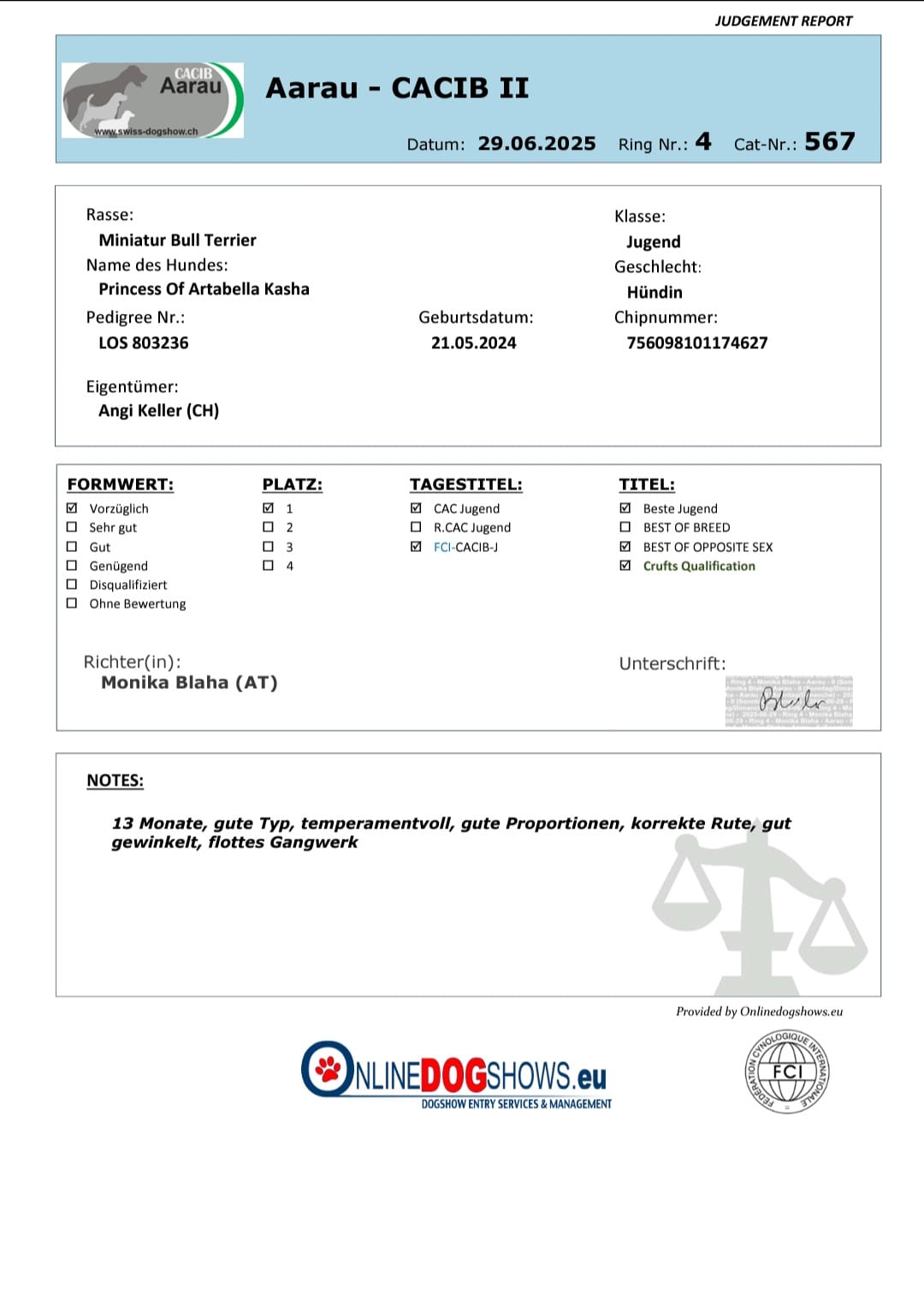 Erfolgreiche Hundeausstellung vom 29.Juni 2025 in Aarau mit Angi und der Hündin Princesse of Artabella Kasha
