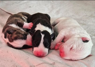 Am 12.2.2025 sind unsere Miniature Bullterrier Welpen zur Welt gekommen. Die drei Jungs sind reserviert.